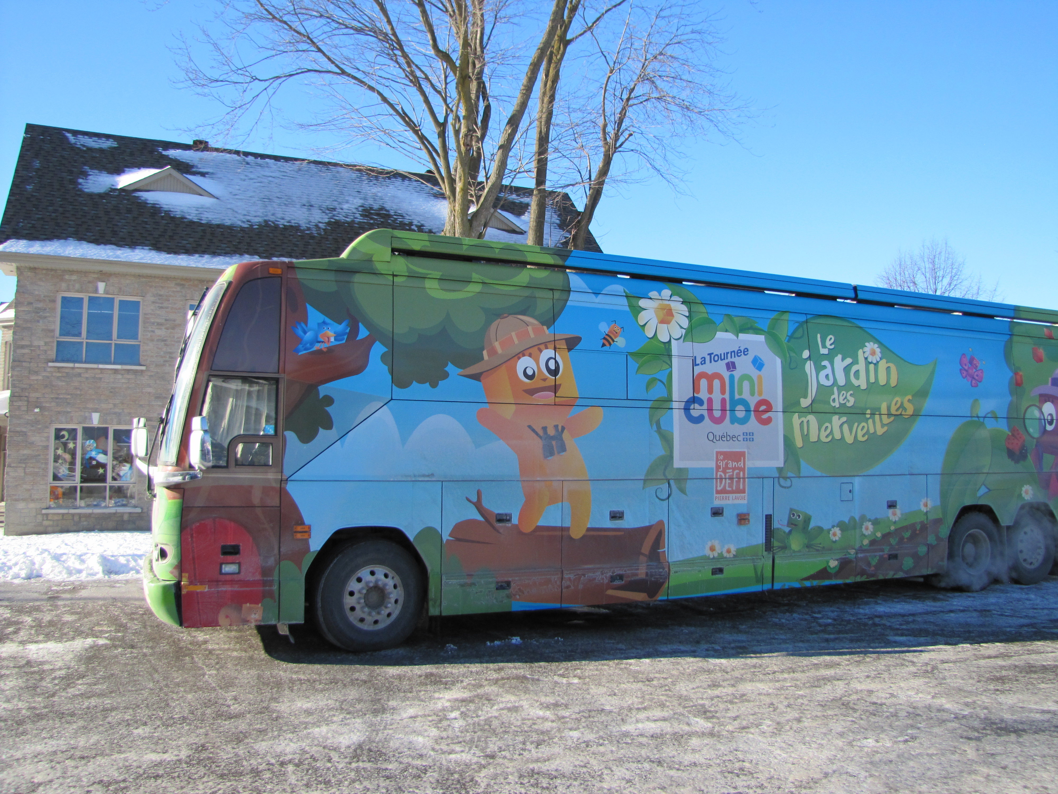 L'autobus Le Jardin des Merveilles de la Tournée Mini Cube mise en action par le Grand Défi Pierre Lavoie en partenariat avec le ministère de la Famille du Québec s'est rendu à Deux-Montagnes pour visiter les enfants de la Garderie Pom'Cannelle.