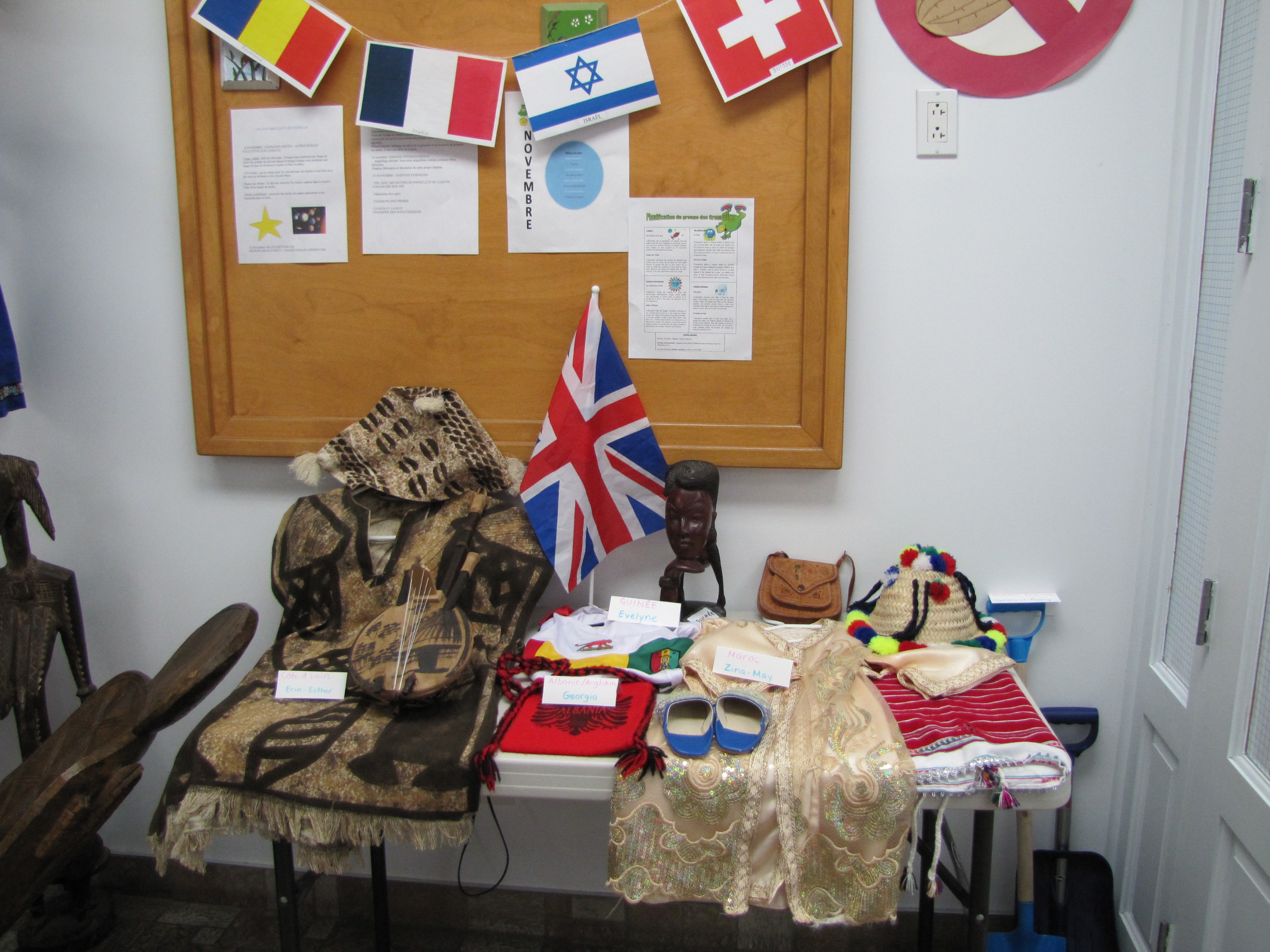Pour souligner la grande diversité ethnique et culturelle, nous organisons une semaine INTERNATIONALE. On affiche des drapeaux des pays d'origine des enfants, des parents et des membres du personnel. Nous organisons aussi une exposition des objets, des photos, des habits traditionnels, etc. de ces pays. C'est un bon déclencheur pour commencer apprendre aux enfants sur les différents éthniques et cultures. Nous sommes très contents de voir que non seulement les enfants apprennent des nouvelles choses sur le monde mais les adultes aussi :)