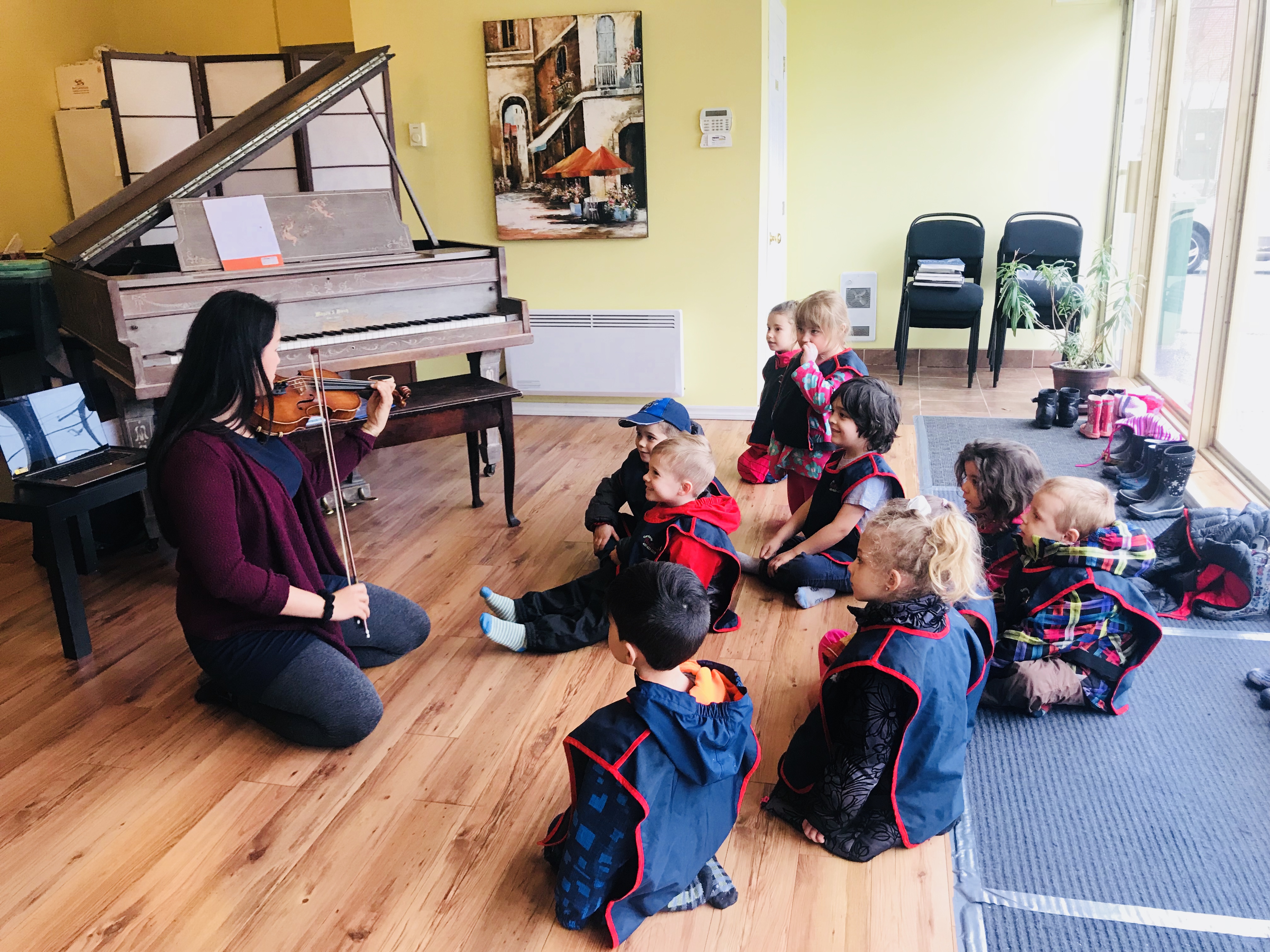 Mélanie, une des professeures de musique de l'école, a joué au violon et elle a appris aux enfants une chanson avec des gestes. Elle leur a présenté plusieurs instruments de musique et les enfants ont eu la chanse de jouer avec.