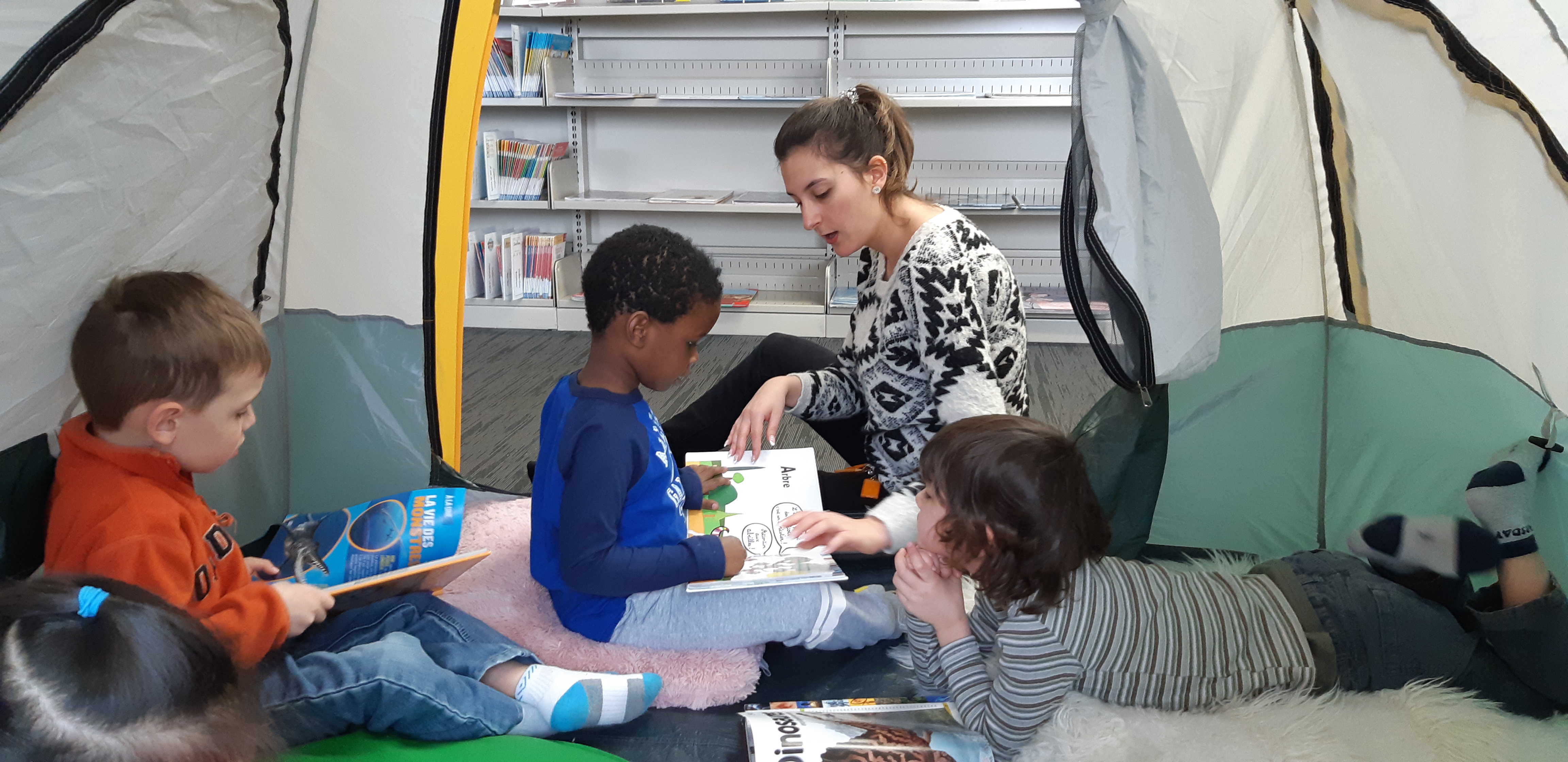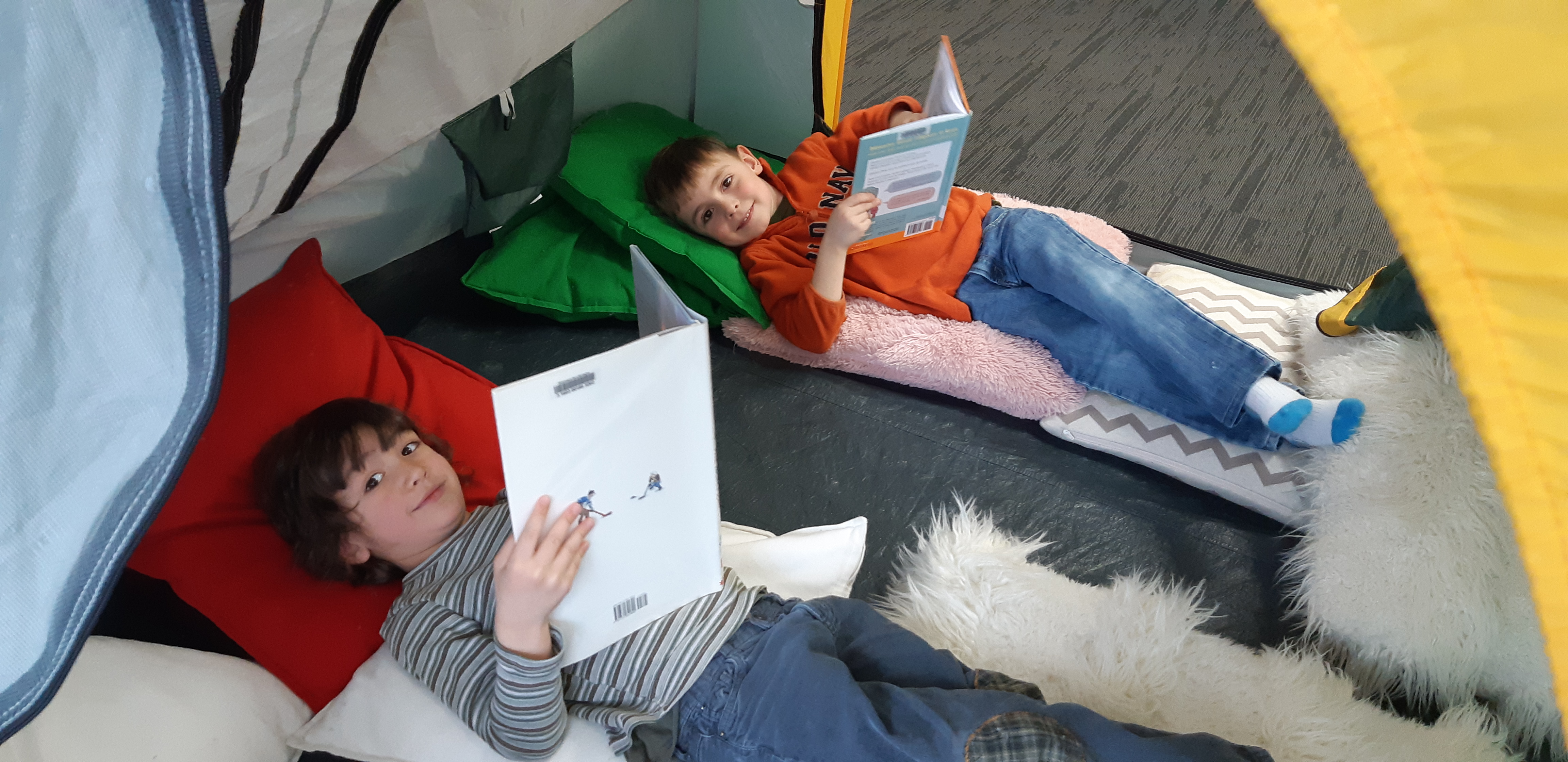Temps de lecture libre (dans la tente, sur le tapis ou à la table) :